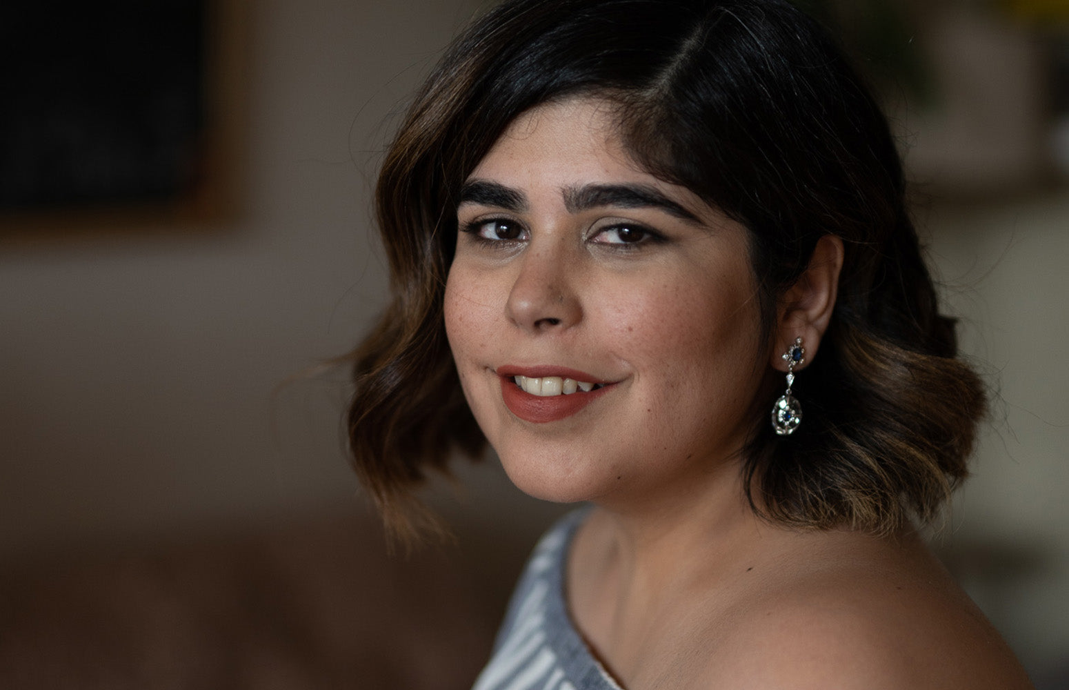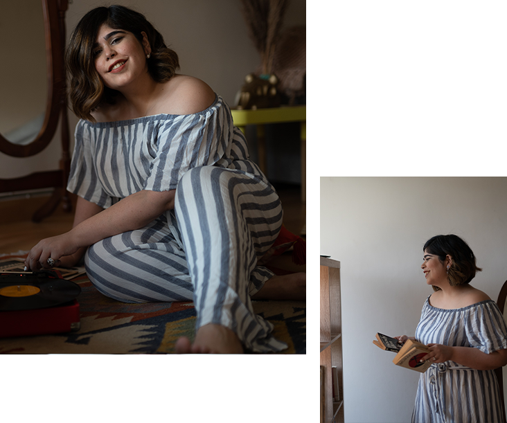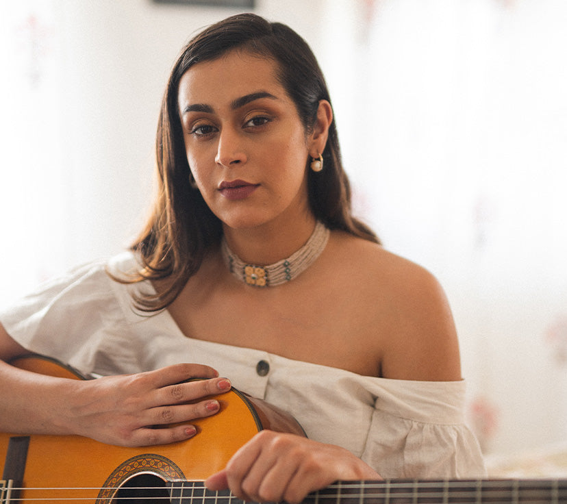 She introduces herself as a musician. She Loves her mom's big chunky earrings. Simple and relatable is her vibe.