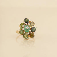 Glamour meets playfulness in these intricately crafted Elysia studs. A central emerald gemstone, framed with a delicate sparkle of natural diamonds, anchors the design. Around it, tourmalines in varying cuts and hues of green unfold like petals, creating a lush, floral silhouette. The vibrant play of color and form gives the earrings a distinctive character sophisticated yet spirited.