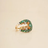 A striking harmony of bold and beautiful, these exquisite hoop earrings are a celebration of color and contrast. Adorned with vibrant mosaic of green gemstones, citrines, and shimmering diamonds. The circular form comes alive with a playful rhythm of hues and textures, creating a statement piece that is both spirited and sophisticated destined to steal the spotlight.