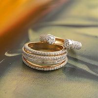 Mellowed sophistication with a hint of quirk is what the Dahlia ring stands for. The central unit featuring natural brilliant-cut diamonds is surrounded by delicate units of yellow tourmalines that shimmy with the movement of your hand, the highlight of this eccentric jewel.