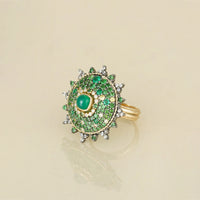 A striking sunburst earring featuring a vivid cushion-cut Green Onyx at its center, surrounded by a mosaic of lush green Emeralds, Tsavorite, Ye. . . Read More