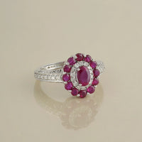 Handcrafted in gold, our take on the classic solitaire ear studs, Azure holds a faceted ruby at its heart with a double halo of natural diamonds and ruby rounds.