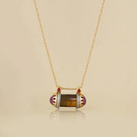 Handcrafted in gold, these earrings feature a drop made in Tiger's Eye, with a gold-set ruby at its heart. The drop is suspended from a clip closure dressed in faceted emeralds.