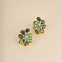 Glamour meets playfulness in this vibrant gold ring. At its heart rests a lush emerald with diamond accents, highlighted by a delicate halo of natural diamonds. Surrounding it, an array of tourmalines in varied cuts and shades of green creates a lively composition. The interplay of tones and shapes lends the piece a distinctive charm sophisticated yet full of whimsical elegance.