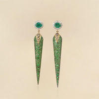 An elegant juxtaposition of the bold and the beautiful, this eccentric band ring is going to make heads turn, we bet you on that! Handcrafted in gold, the ring is dressed in rows of emeralds, with a line of natural diamonds at each end. The ring is held together with emerald studded gold finials. Wear it on its own, or layer it up-it's going to steal the show either way.