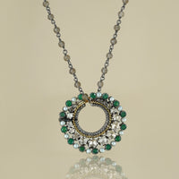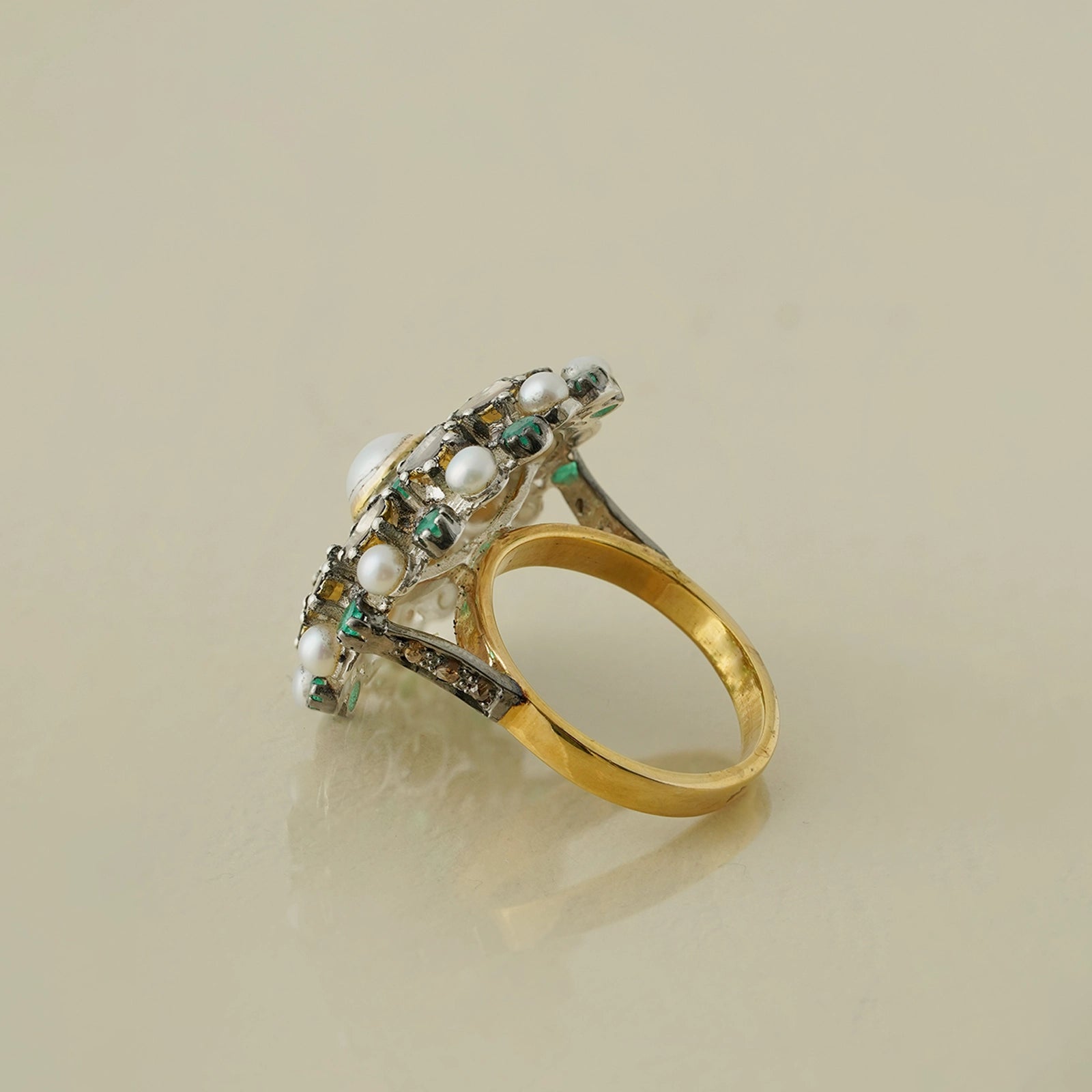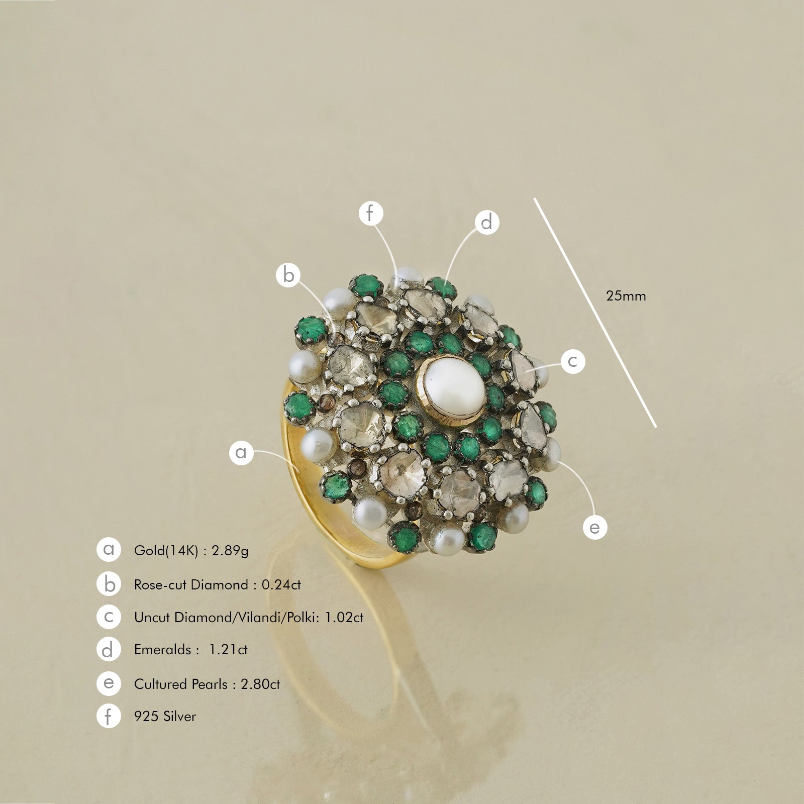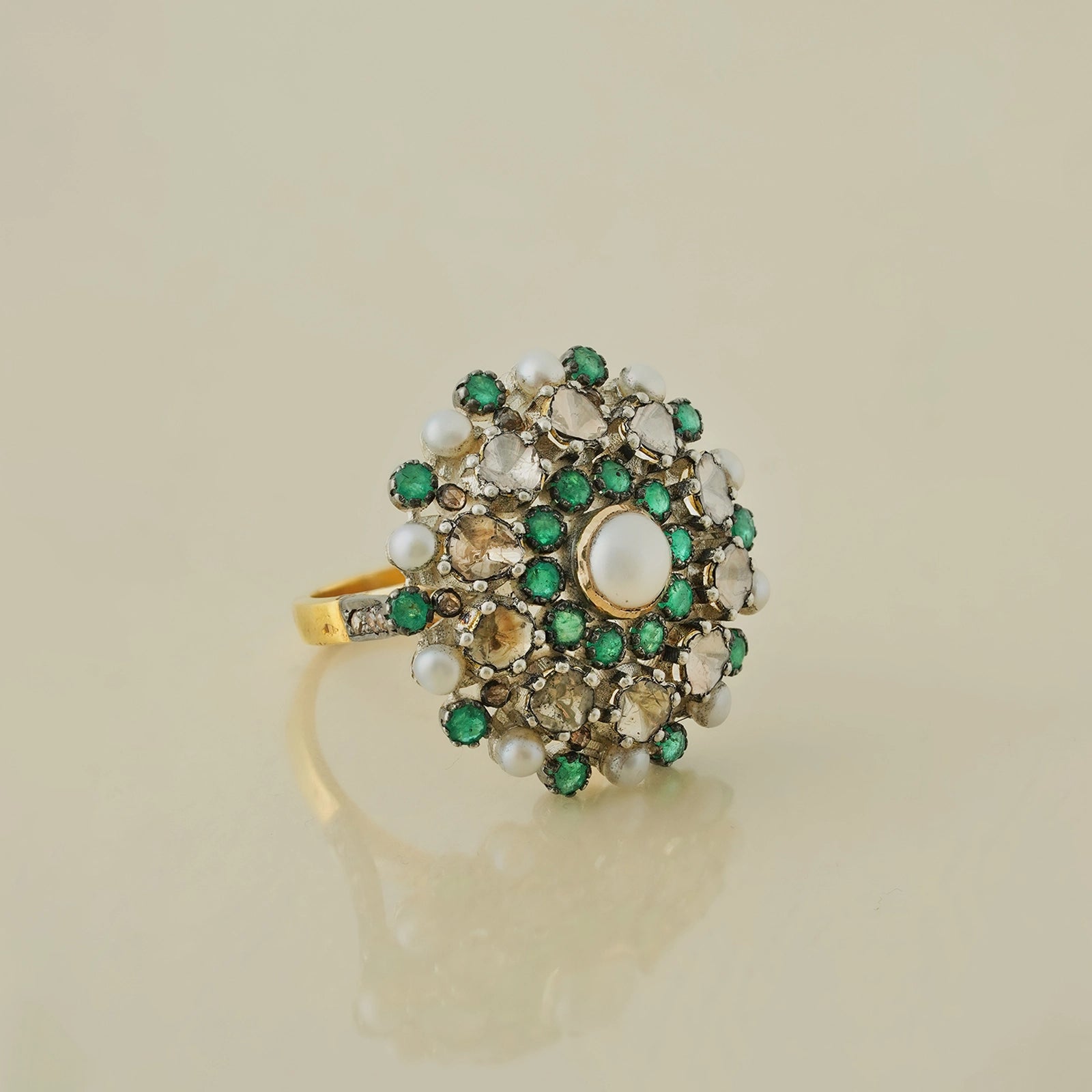 Romantic and refined, the Soha ring is a quintessential piece of jewelry that would catch the attention of any vintage collector. At its heart is a gorgeous, bezel-set pearls, surrounded by halos of emeralds and natural rose-cut diamonds. A ring of alternating emeralds and seed pearls add to its vintage-y feel.