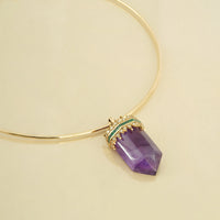 The Promise Earrings strike a chord with the whimsical. Handcrafted in gold, each earring in the pair holds a purple amethyst cut to resemble a crystal, dressed in a tiara of diamonds and emeralds, and is suspended from a natural diamond-encrusted huggie-drop closure. Pair them with our Promise Torque Necklace to complete the look!