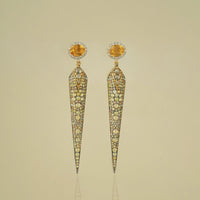 An elegant juxtaposition of the bold and the beautiful, this pendant necklace is going to make heads turn, we bet you on that! Handcrafted in gold, the necklace features a dagger-like pendant dressed in sapphires, with natural rose-cut diamond-set discs, sapphire beads, and Tahitian pearls on either side. Wear it on its own, or layer it up-it's going to steal the show either way.