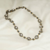 Our love for old school workmanship shines through in this beautifully handcrafted bracelet that is a string of elements worked in silver, holding natural uncut diamonds combined with the quirk of black enamel detailing, lined with pave- set natural rose-cut diamonds. An interesting detail about this piece is that the natural rose-cut diamonds are set both on the front and reverse side of each unit. This allows the bracelet to sit freely on the wrist without the fear of natural diamonds not being seen.