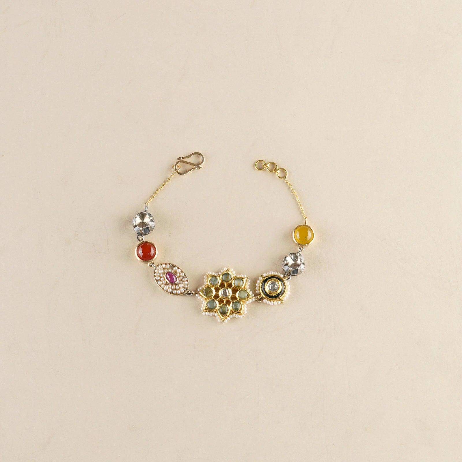Iram bracelet is a celebration of color and craftsmanship, featuring seven handcrafted charms adorned with Natural uncut diamonds, ruby, yellow sapphire, pearls and other gemstones.