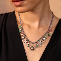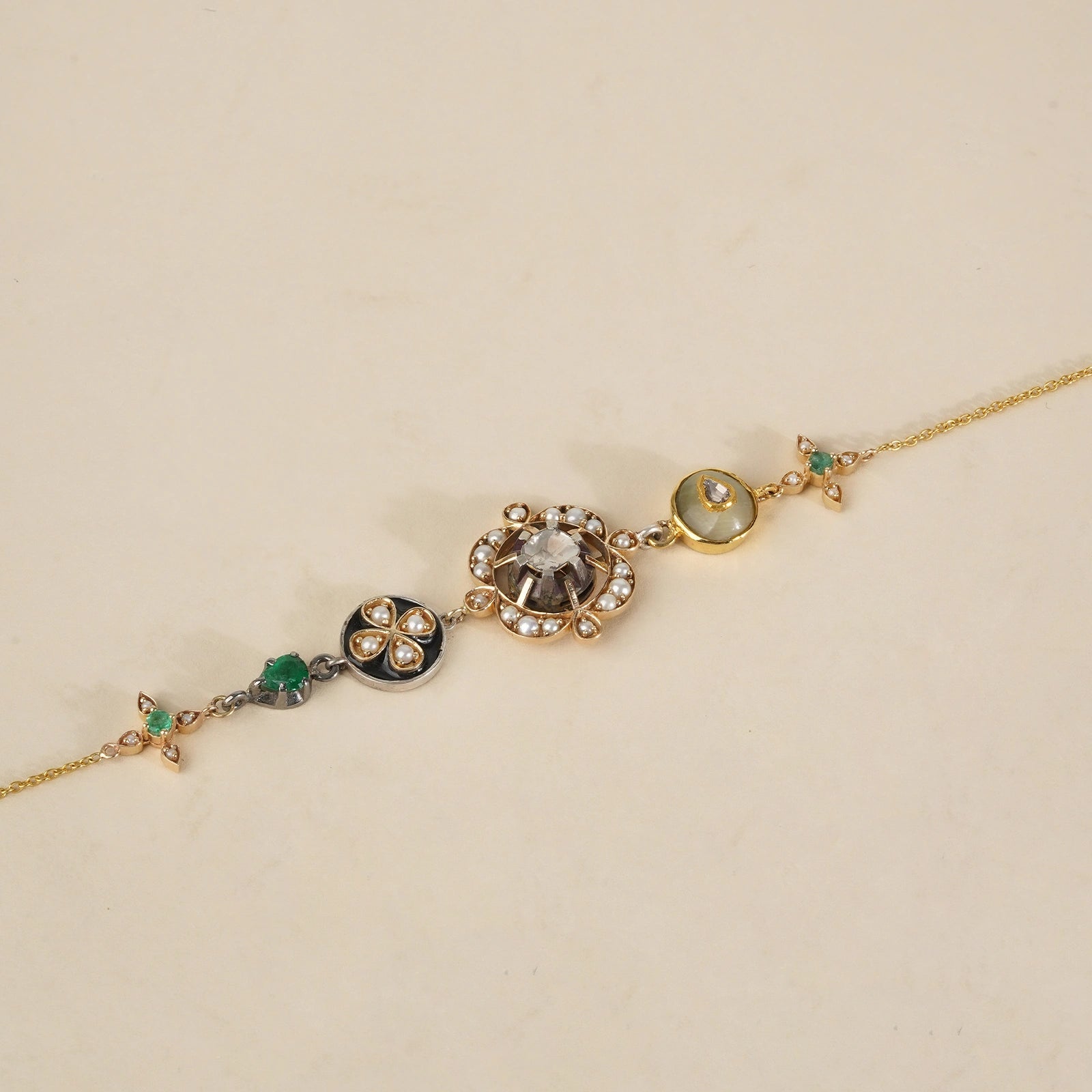 The Sana Bracelet elegantly combines sophistication and artistry, featuring six handcrafted charms set with natural uncut diamonds, emeralds, pearls, catās eye, and enamel detailing.
