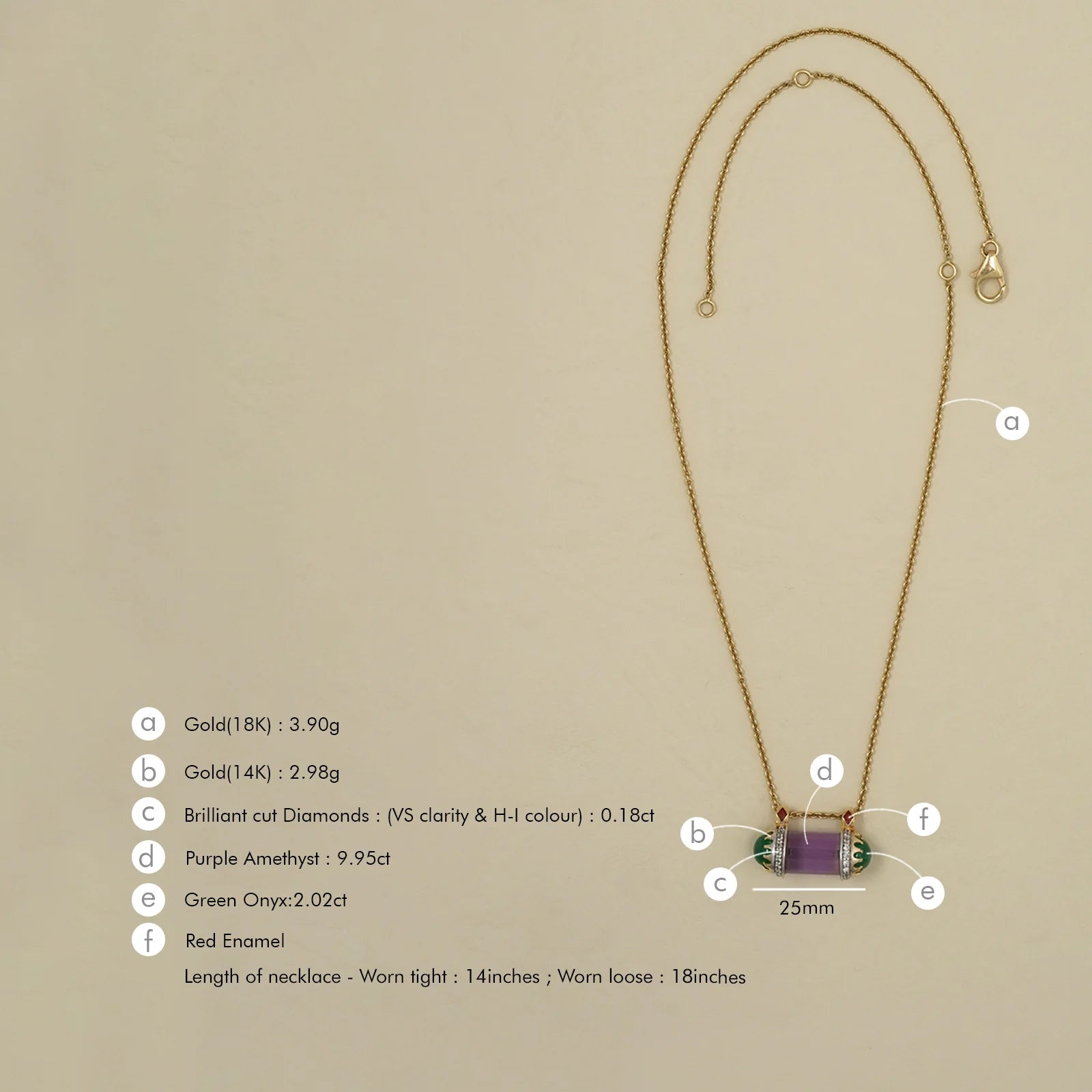 Delicate yet bold, this necklace draws from the form of an amulet. It features a petit pendant crafted with an amethyst at the centre, decorated with diamonds, and cabochon emerald finials.