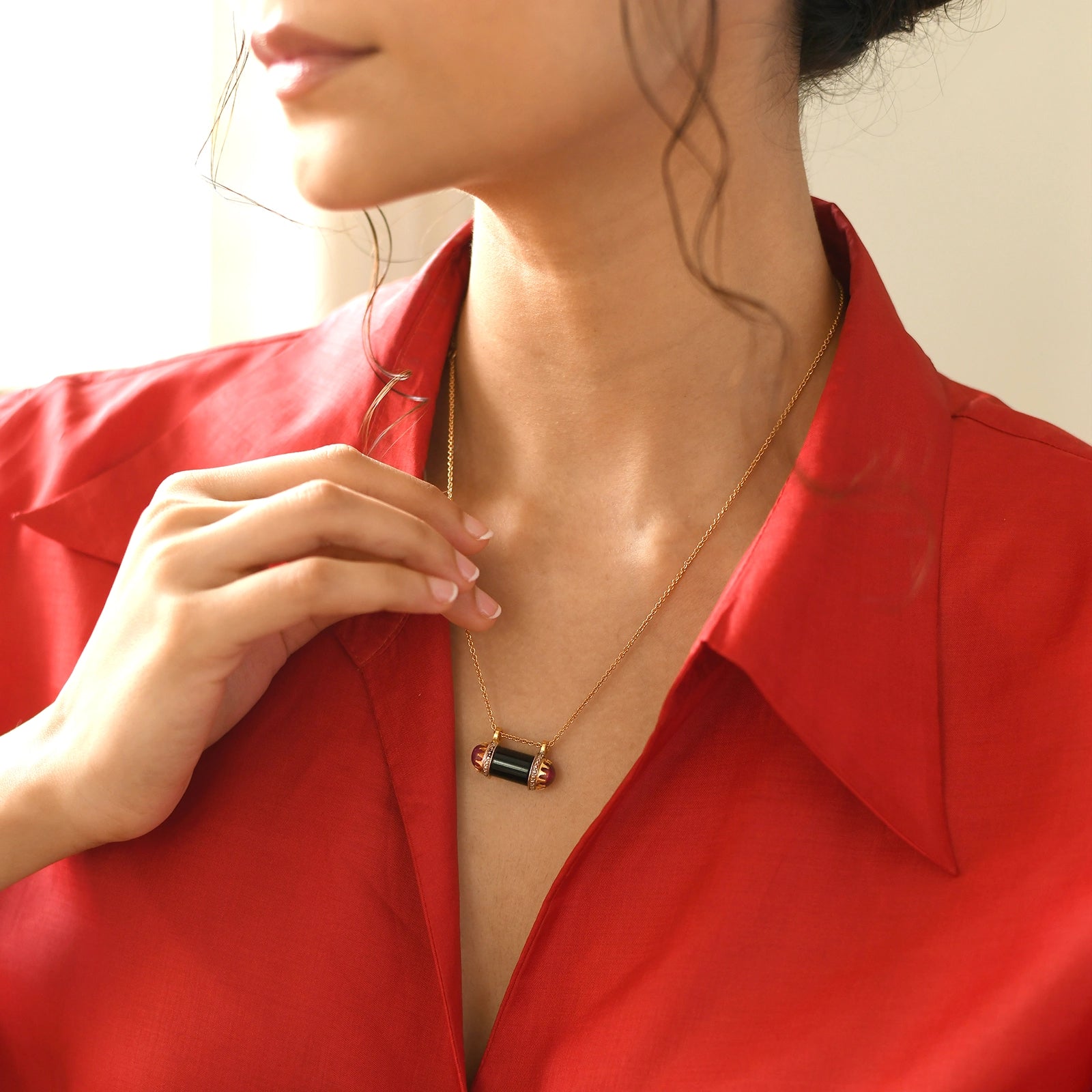 Dainty yet playful, Aurora is the perfect indulgence for every day! Drawing from the form of an amulet, it features a petit pendant crafted in black onyx, accentuated by natural diamonds, and held together by ruby-studded finials. It’s pretty on its own and plays well when layered with other pendants.