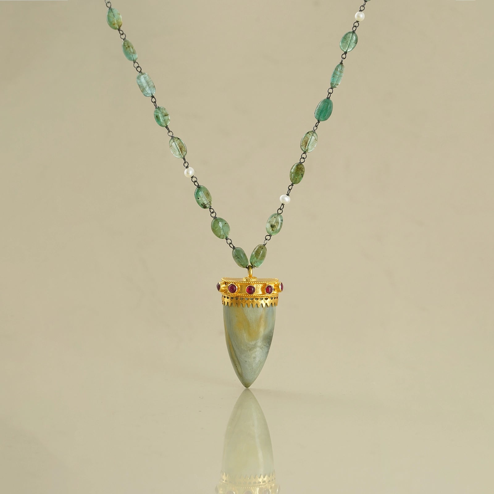 The pendant features a claw-like motif worked in cat's eye stone, held by a gold frame dressed in glass-filled rubies. The pendant is suspended by a ganthan mala of emeralds, spinels, and pearls.