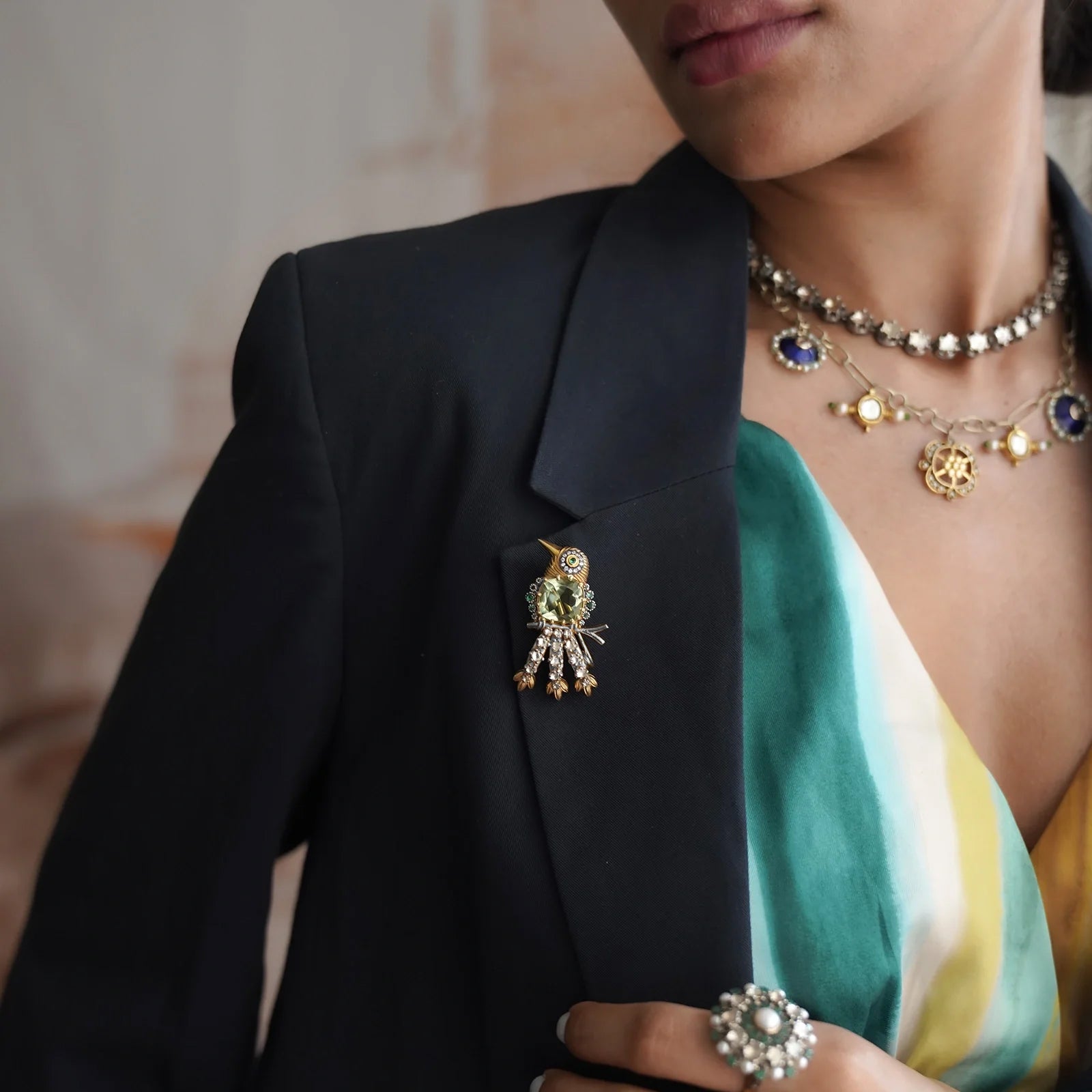 Petit, yet precious, this brooch resembles a bird perched on a branch with poise. At its heart - a green amethyst bordered by emeralds. Faceted natural diamonds grace the tail and add the sparkle in the eye.