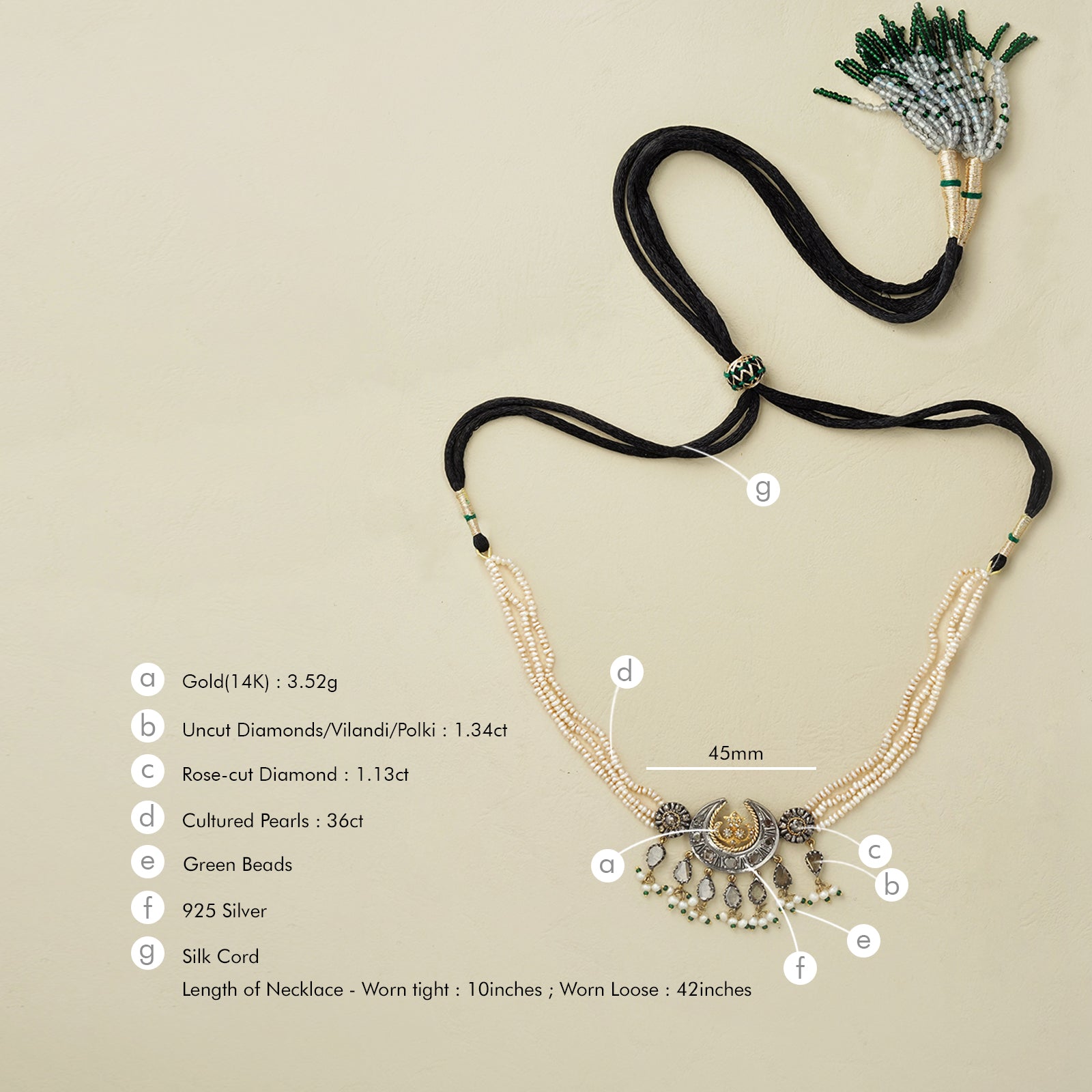 Among the guarded treasures of jewels that our mothers and grandmothers hold, there's always one piece that we fall in love with at first sight. And the Mehnoor Choker Necklace is one such piece. Showcasing a unique play of silver and gold, Mehnoor is dressed in the timeless elegance of Natural rose-cut diamonds and strung on lines of seed pearls, perfect for someone who prefers to keep things understated and loves everything vintage.