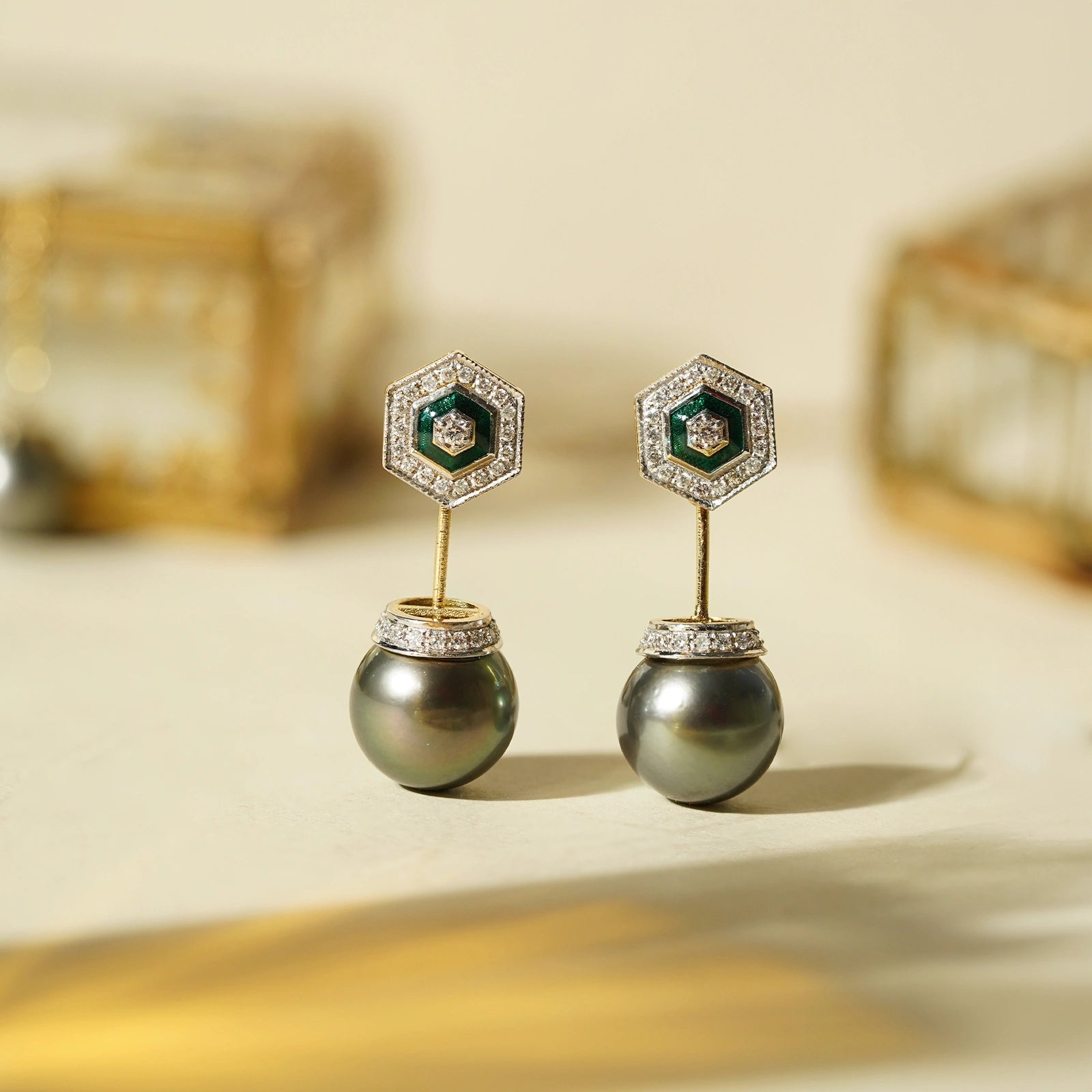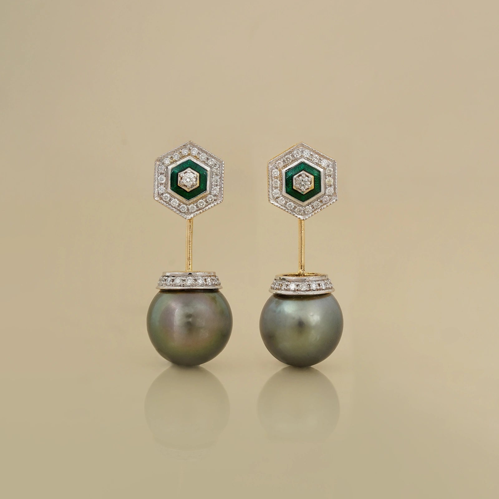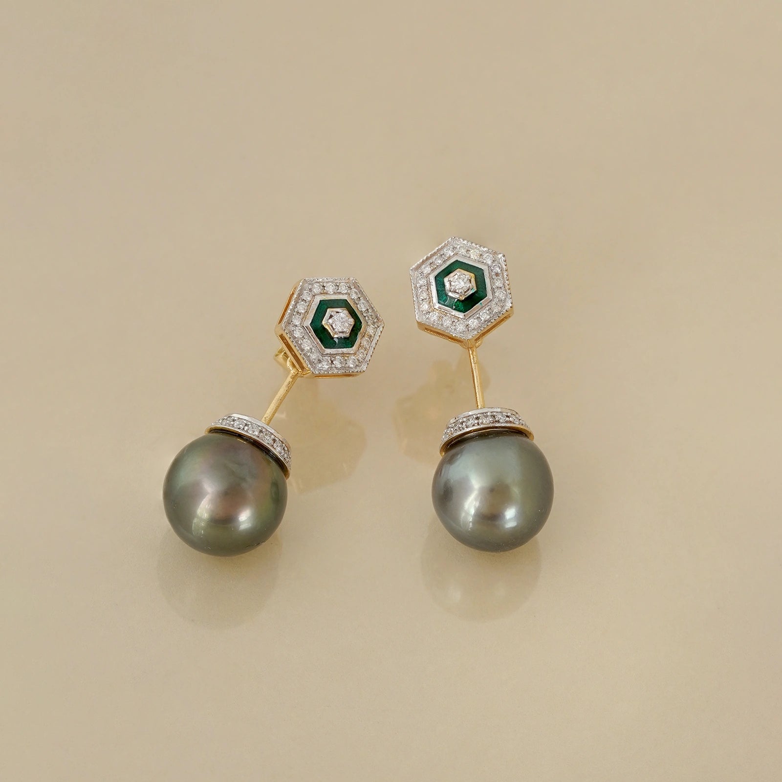 Dainty yet playful, Tahitian pearl earrings are a perfect indulgence for every day of the week. Crafted in gold with green enamel detailing, the front is a diamond-encrusted hexagonal stud, while the back has a tahitian pearl drop connected to a diamond disk. Wear them to sundowners, on dates, or just to elevate your work-wear