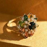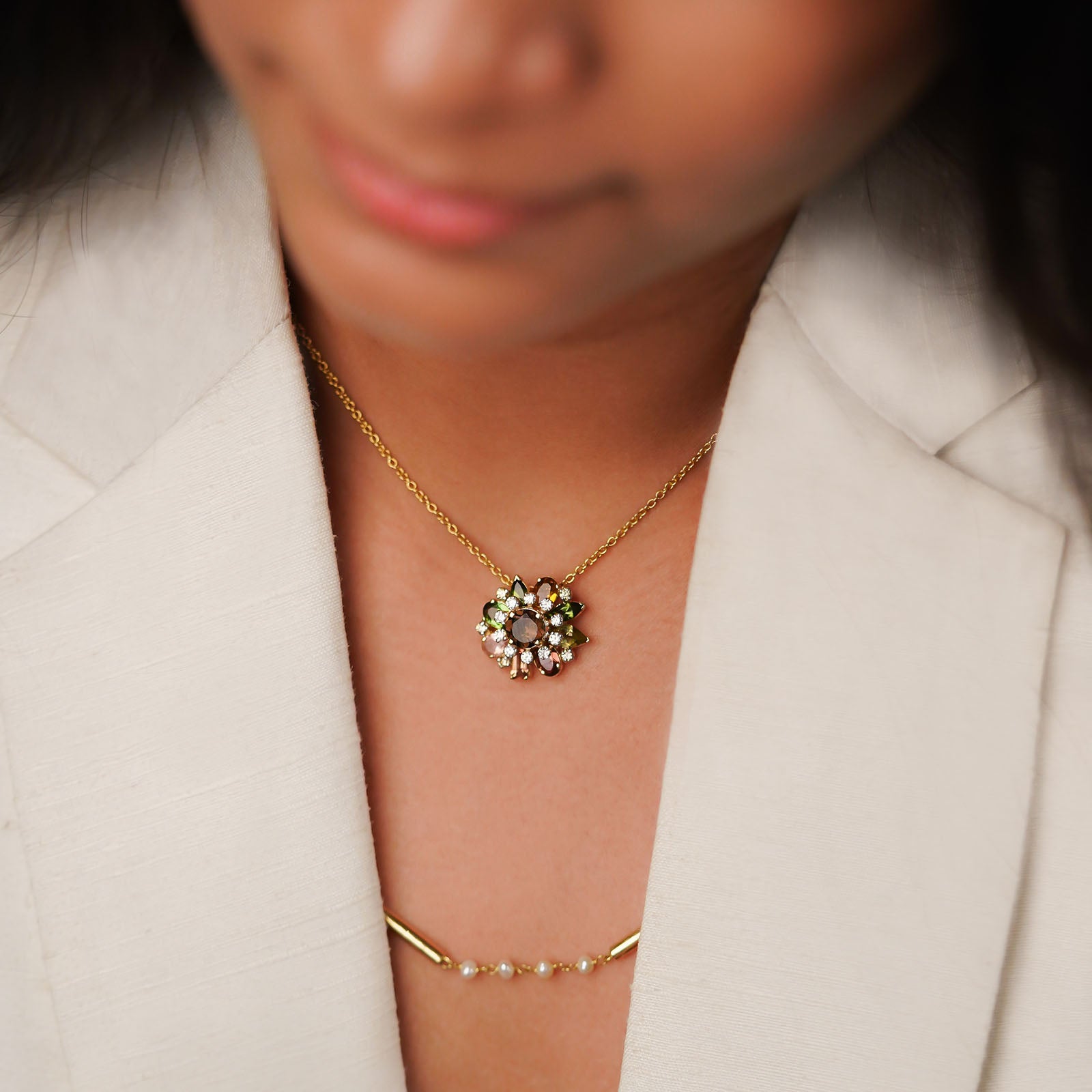 Minimal, glamorous, and playful define the entirely of this pendant intricately worked in gold. The central gemstone is lined by natural diamonds and elevated on a bed of varying cuts and colors of tourmaline, giving it a distinctive look. Suspended from a delicate gold chain, it speaks a visual language of refined sophistication .