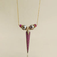 An elegant juxtaposition of the bold and the beautiful, this pendant necklace is going to make heads turn, we bet you on that! Handcrafted in gold, the necklace features a dagger-like pendant dressed in rubies, with natural diamond-set discs, ruby beads, and Tahitian pearls on either side. Wear it on its own, or layer it up-it's going to steal the show either way.