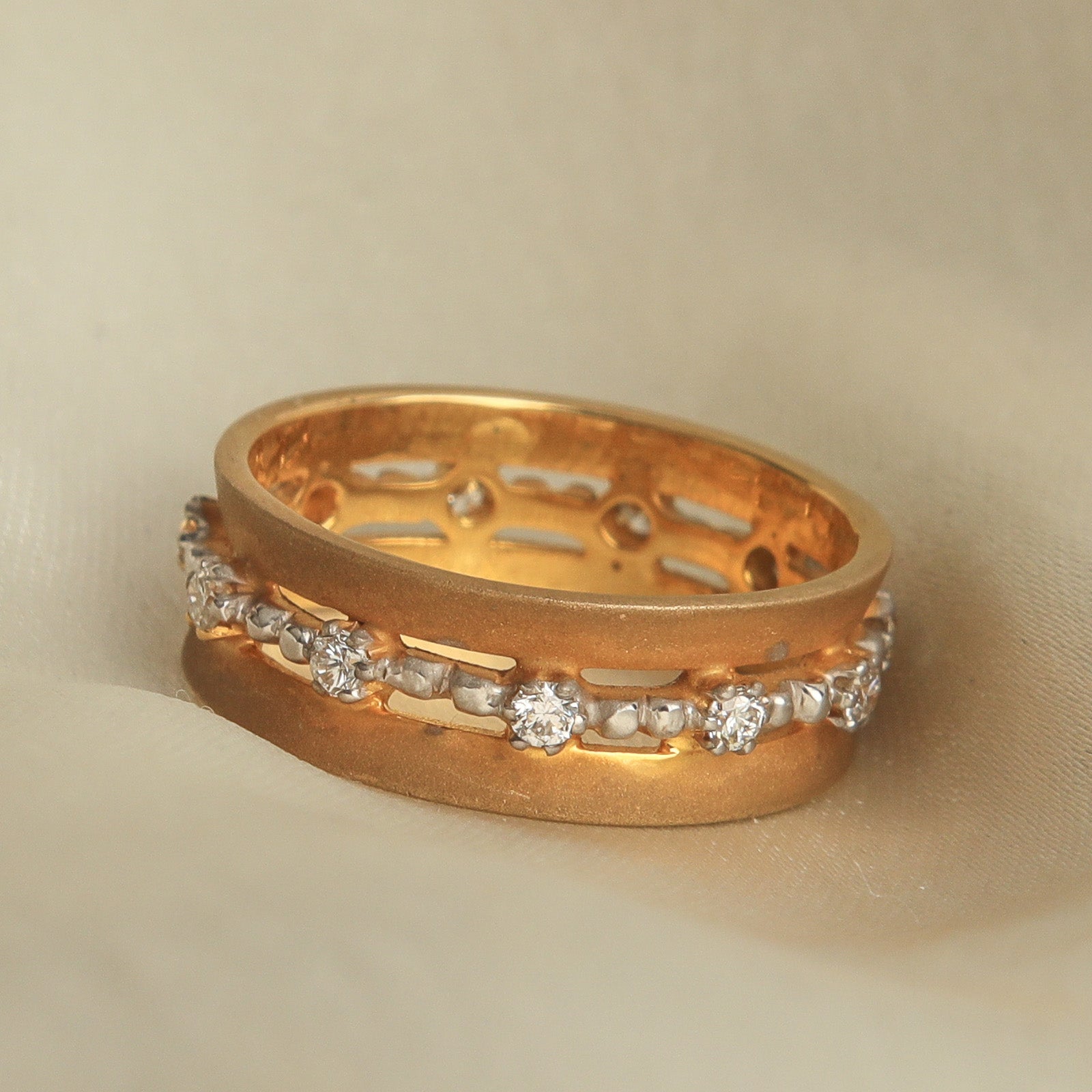 There's beauty is simplicity! We stand by this and this ring is our attempt at just that. A plain matte finished band worked in gold with a centre band of prong-set natural diamonds.