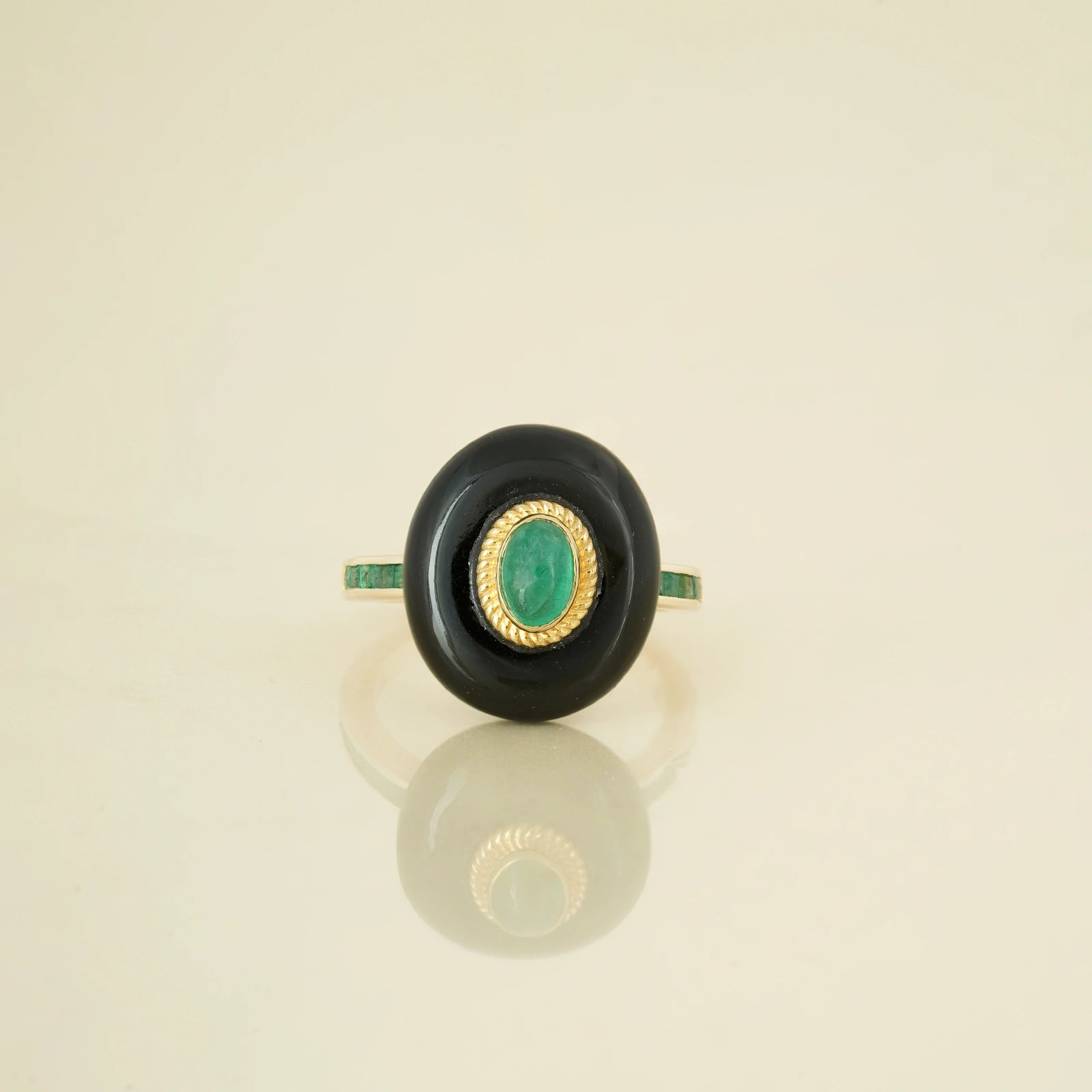 The design is worked in gold and a Black Onyx with a gold-set emerald at its heart. A surprising detail of the shank channel set with faceted emeralds peeks from the sides.