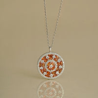 A band of sunshine for your hand, the Phoebe ring is an elegant juxtaposition of the vivid hue of the orange sapphire with the white of evenly interspersed natural brilliant-cut diamonds. Enclosed in rings of pave-set natural diamonds, this gorgeous ring is bound to add a little extra 'sunny' to your day!
