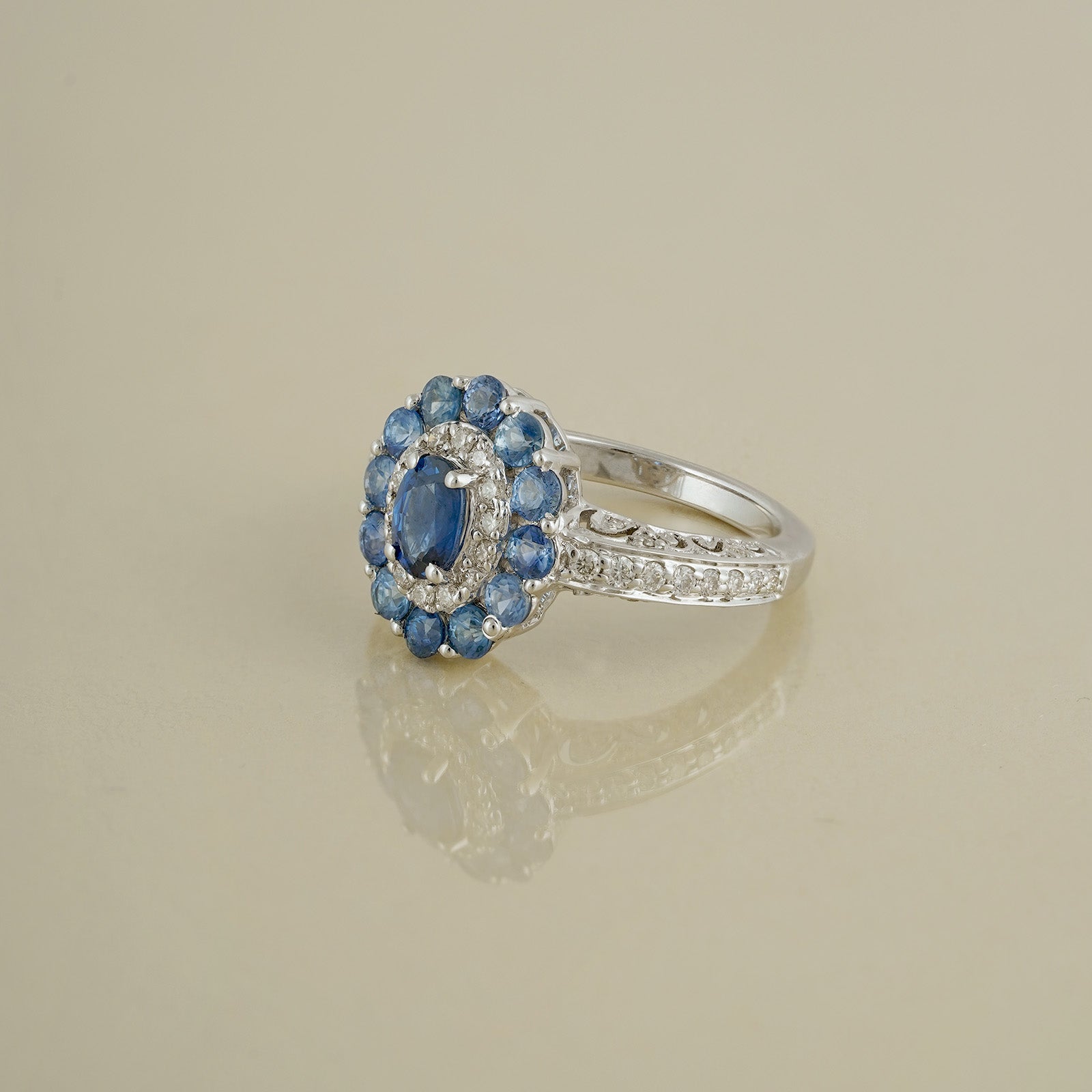 Add an effortless sense of glamor to your daily wardrobe with Azure, a versatile ring that goes well with jeans and a shirt, a satin gown, as with a cocktail dress! At its heart sits a pretty, faceted blue sapphire, nestled in a halo of natural brilliant-cut diamonds. The diamonds are further surrounded by a halo of faceted sapphires. The diamond-encrusted shank take the cake!