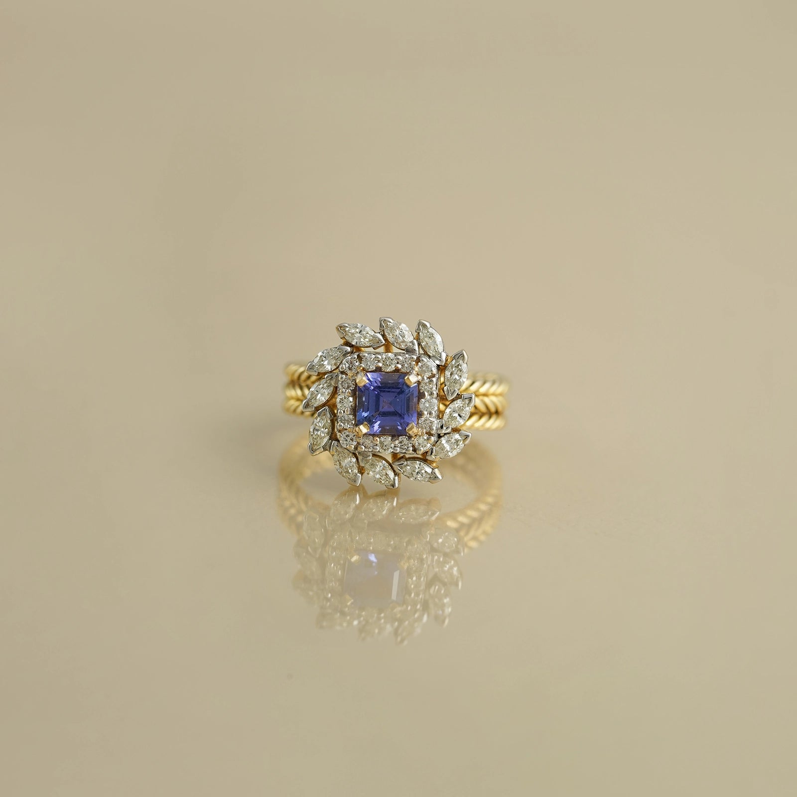 Our take on a classic solitaire ring, the Eden holds a faceted gemstone at its heart, with pave-set natural diamonds and prong-set marquise natural diamonds giving it company. It features a signature braided wire / cable detailed shank. The center stone has three options- Green Emerald,Red Ruby and Blue Tanzanite .