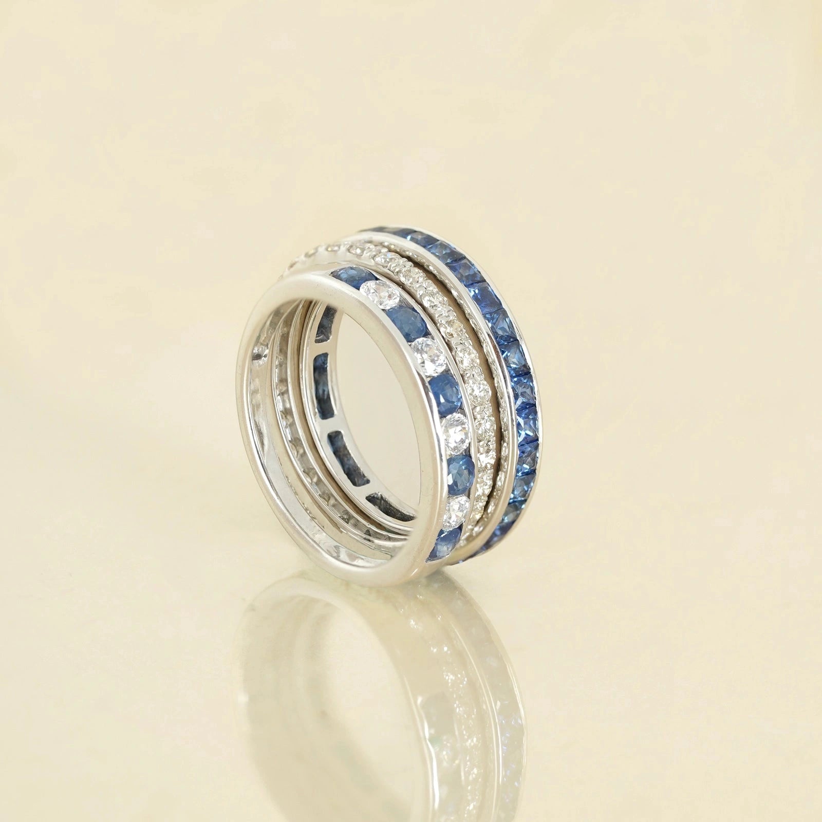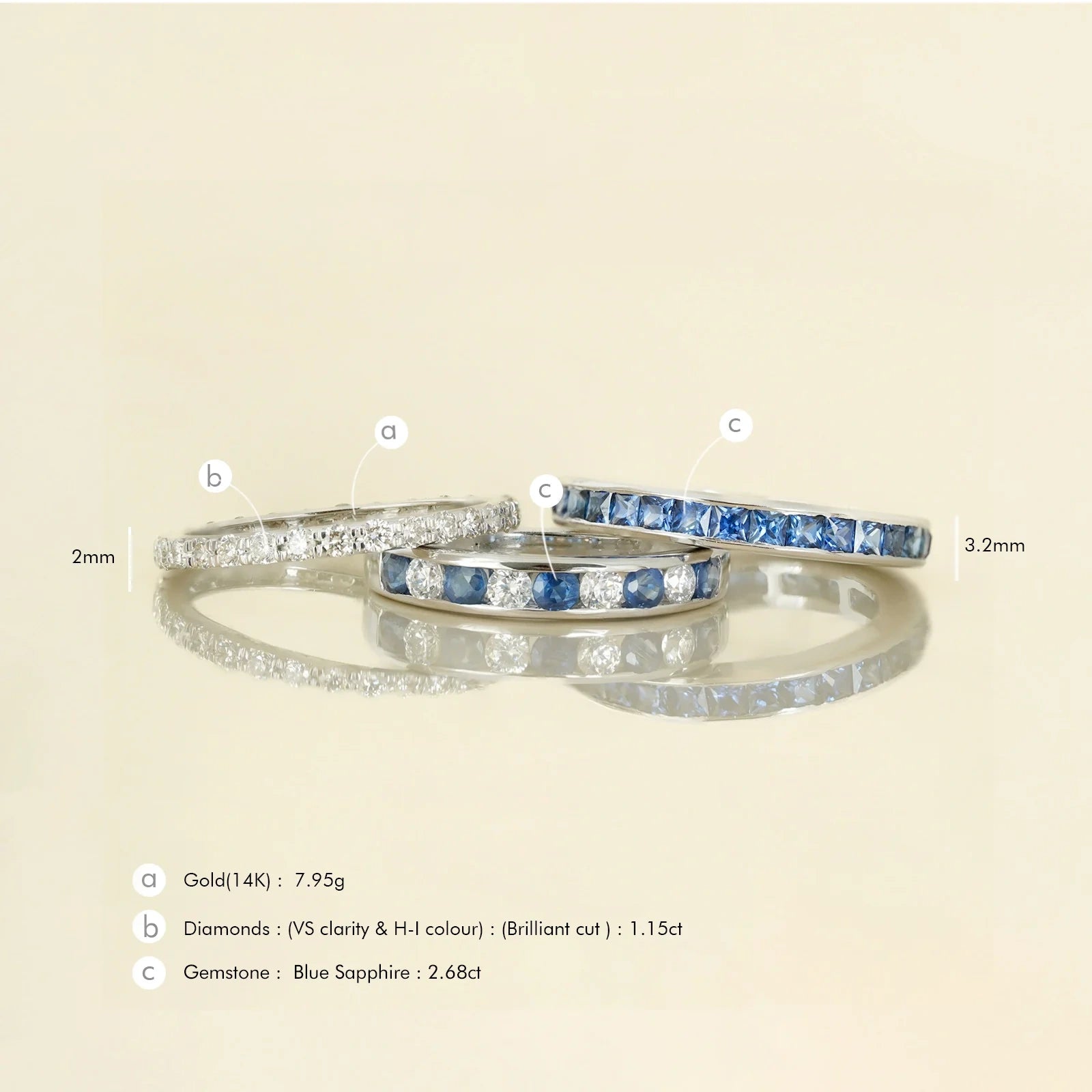 The Stella blue sapphire ring set adds an effortless sense of glamour topped up with our signature pop of color. The ring set features bands of channel-set natural diamonds and blue sapphires on either side of an all-diamond band. Wear one, wear all-however you like it; it will always shine through, we promise!