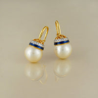 Dainty and versatile with a dash of romantic, this pendant necklace elevates your every day from ordinary to blissful. The pendant holds a beautiful South Sea pearl between two natural diamond-studded hemispheres, bordered with blue enamel, and is suspended from a gold chain.