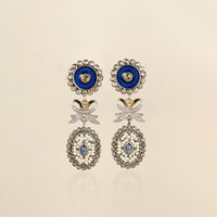 The choker holds an oval pendant painted blue with enamel and dressed in natural rose-cut diamonds using open setting (pachchikam). Strung on lines of cultured pearls interspersed with iolite beads, the design exudes a certain type of romance, evoking a striking imagery of the Victorian era.