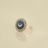 Equal parts pretty and whimsical, the Gina Cobalt Blue Earrings play with a variety of materials and techniques. Two elliptical discs, dressed with seed pearls around a cabochon sapphire are suspended from a natural diamond-set top, painted blue with enamel and bordered with bezel-set natural rose-cut diamonds. A bow-shaped unit dressed in natural diamonds connects the two.