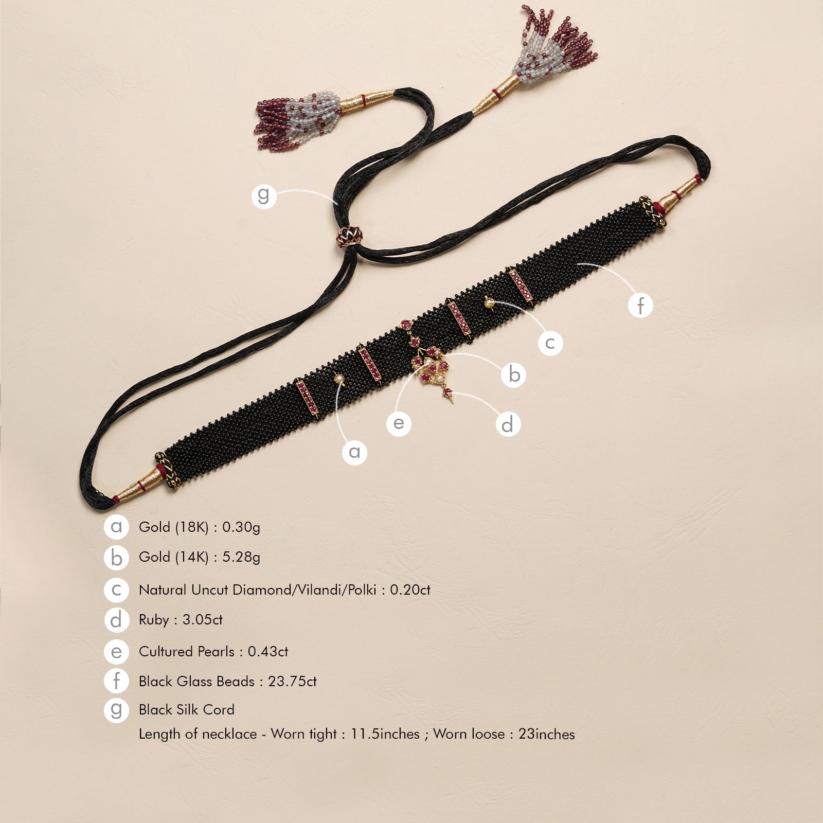 Bold yet graceful, the Leena Choker Necklace is designed with elegant black bands of pearl carpet, crafted using the piraai technique. The necklace features ruby-set gold plaques enhanced with luminous uncut diamond. At its heart is a delicate floral motif adorned with rubies and pearls that creates a sense of harmony and balance across the band, while the striking central design captures attention. A seamless blend of craftsmanship and contemporary allure, this choker stands as a timeless statement piece.